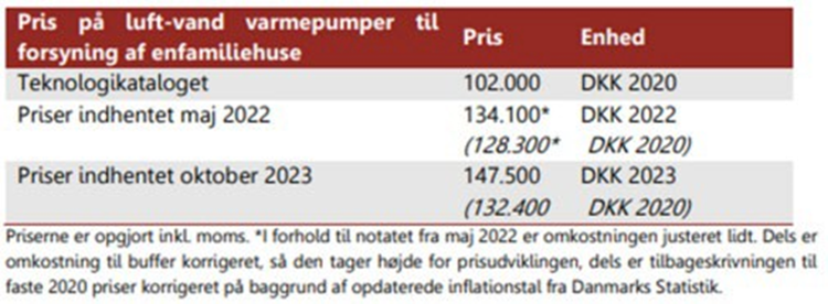 EA Energianalyse har tidligere udarbejdet prisundersøgelser, der viser, at prisen for det reelt ligger på et højere niveau. I 2023 blev det vurderet, at prisen på en varmepumpe var steget med knap 50 pct. i løbende priser siden 2020 og derved med 20 pct. mere end den generelle inflation i samme periode.