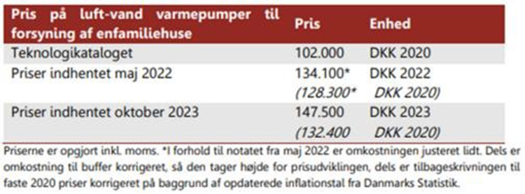 I høringsmaterialet er prisen på en luft-/vand varmepumpeinstallation (207 HP air-water, ex single) fastsat til 12.900,- € svarende til ca. 120.000,- kr. inkl. moms.