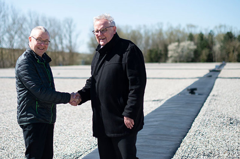 De to formænd, Nils Olsen og Steen Christiansen, lykønsker hinanden ved den officielle indvielse af damvarmelageret. Foto: Louise Nordtorp Veng.