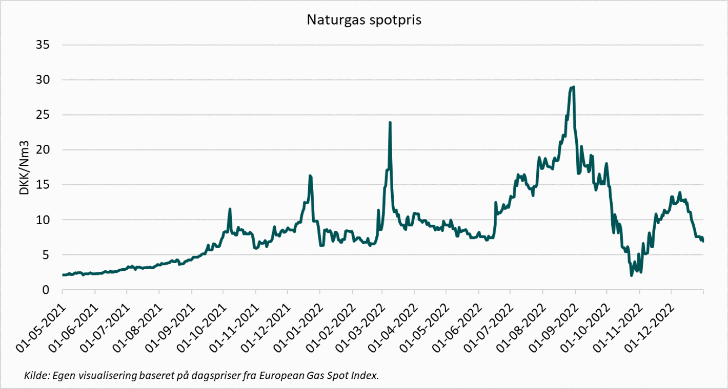 Selv om prisen på naturgas er faldet markant og vedvarende siden august 2022, så den seneste pris i uge 21 fra TTF-grossistmarkedet i Holland lyder på 2,26 kr. pr. Nm3, så er den fortsat pænt højere end de omkring 80 øre pr. Nm3, man kunne købe gassen til i sensommeren 2021 – altså for mindre end to år siden.