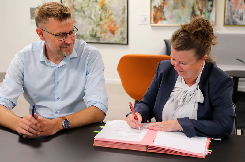 Borgmester Merete Amdisen og kommunaldirektør Kåre Svarre Jakobsen har netop sat underskrifterne på selskabsgørelsen af Ishøj Varmeværk, som fremover bliver et datterselskab i Ishøj Forsyning.