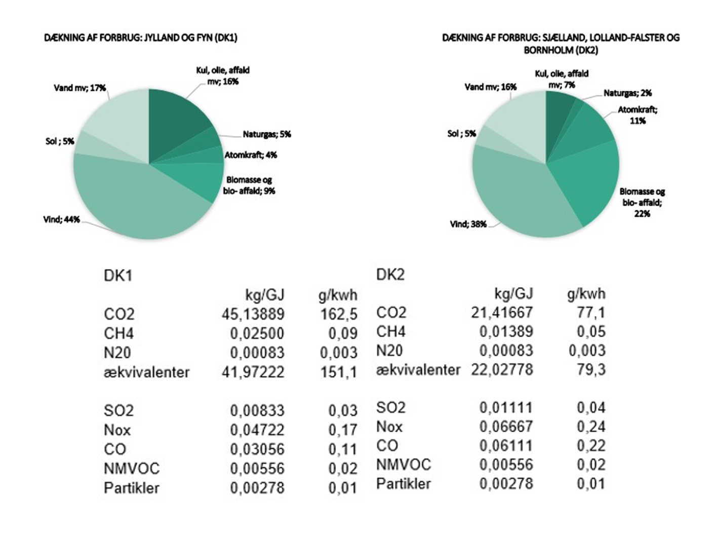 De nyeste emissioner for el som brændsel for DK1 og DK2 med 200% metoden fra 2022:
