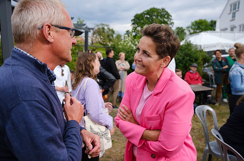 Dansk Fjernvarme afholdt i 2023 sit efterhånden traditionelle arrangement, Jazz i Haven, som også bliver gentaget i år. Det får typisk besøg af en række politikere - som sidste år, hvor direktør i Dansk Fjernvarme, Kim Mortensen, fik lejlighed til at hilse på formanden for SF, Pia Olsen Dyhr. Foto: Jesper Voldgaard.