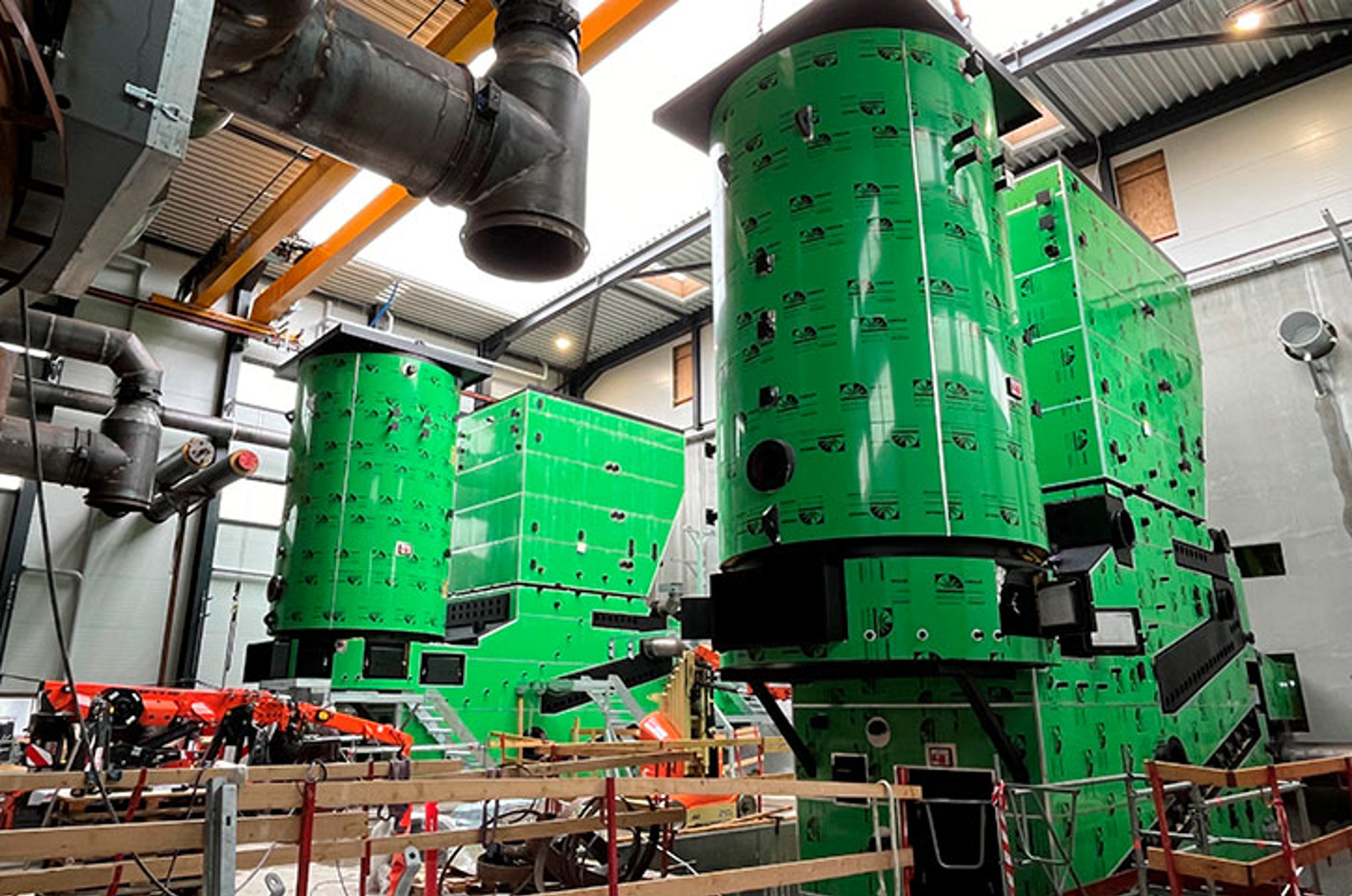 Inde i bygningen stod et hold montører og svejsere for at samle kedlerne, og samlet tog det teamet 11 timer at løfte og samle de to nye halmkedler.