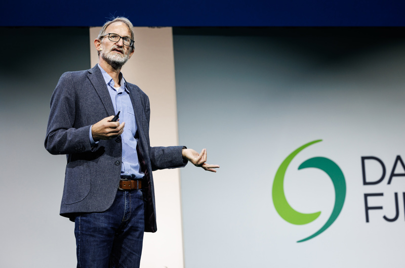 - Det at se en positiv fremtid motiverer meget mere end en negativ. Så det dur ikke at sige: Hvis du ikke gør det her, så dør du. Det er faktisk ikke nok. Men siger du: Her ude i fremtiden kan det blive så fedt, du kan tage en kop vand direkte fra en bæk og drikke af den. Hvilken fremtid vil du gerne have? Det rykker os, sagde Martin Kruse på Landsmøde 2024. Foto: Jesper Voldgaard.