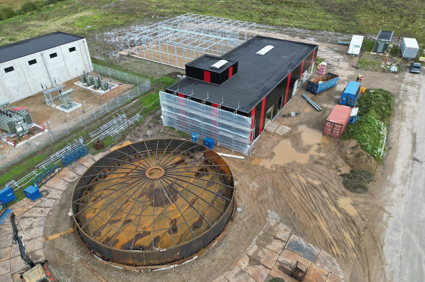 Billedet her viser etableringen af akkumuleringstanken, der nu er færdig - i baggrunden er det varmpepumpeanlægget, der er ved at blive materialiseret. Foto: Løsning Fjernvarme.