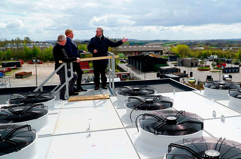 Direktør for Ry Varmeværk, Flemming Joel Skjødt, viser frem på toppen af det nye varmepumpeanlæg i forbindelse med sidste uges rejsegilde. Foto: Ole Jeppesen.