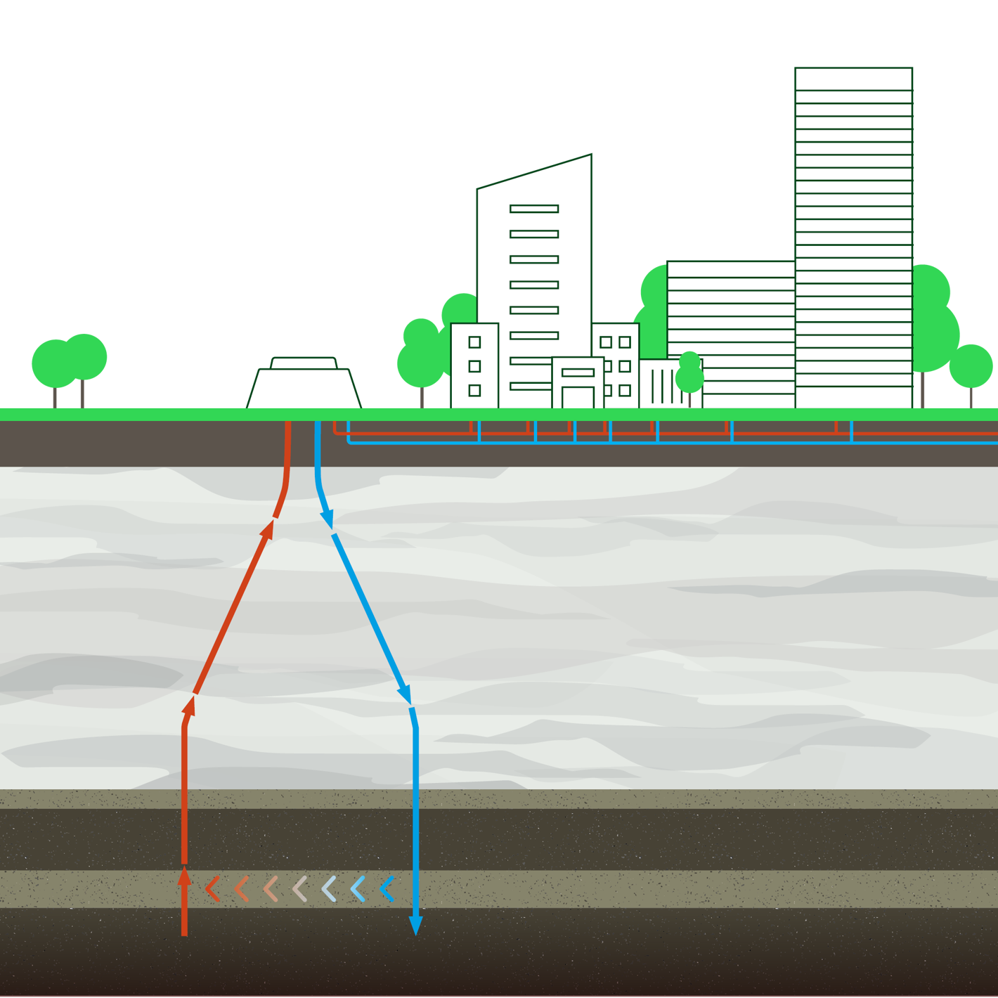 - Først filtreres vandet, så sand og andre urenheder fjernes. Så varmeveksles der direkte ned til fjernvarmens returtemperatur (ca. 40 grader), og endelig trækkes den sidste varme ud af geotermivandet via varmepumper (ned til 10 grader), inden det geotermiske vand pumpes retur i undergrunden til genopvarmning og for at bevare trykket i undergrunden.