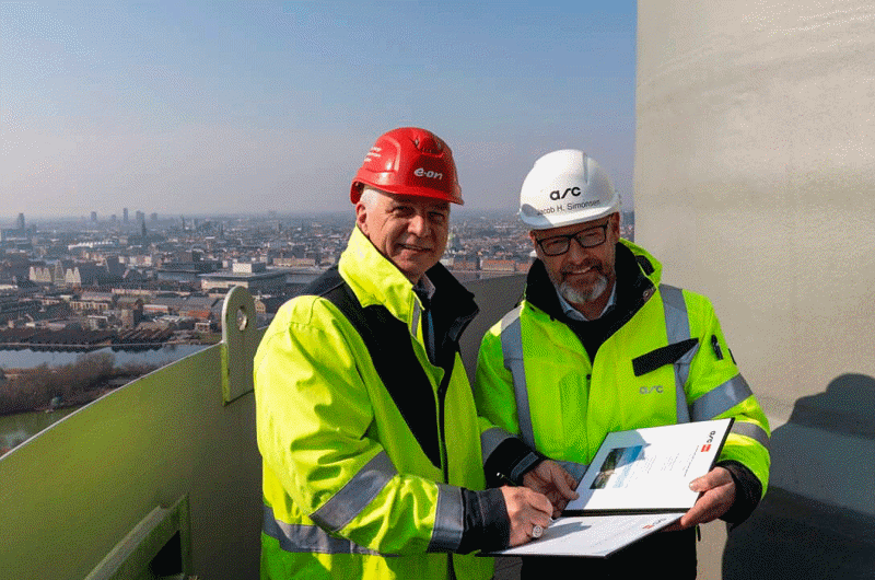 Marten Bunnemann, CEO for E.ON Energy Infrastructure Solutions, underskrev sammen med direktør Jacob Hartvig Simonsen fra ARC aftalen på toppen af Copenhill. Foto: ARC.