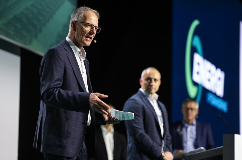 Bjarne Munk Jensen var som direktør for Kredsløb draget fra Aarhus til Odense for at være med til at annoncere åbningen af geotermi på Landsmøde 2025. Samir Abboud - CEO i Innargi - var også med på scenen sammen med direktør i Dansk Fjernvarme, Kim Mortensen. Foto: Jesper Voldgaard.