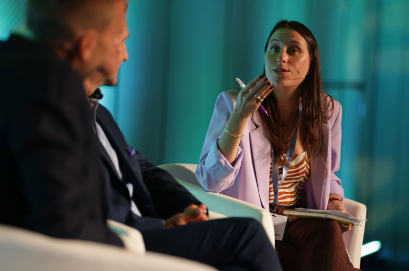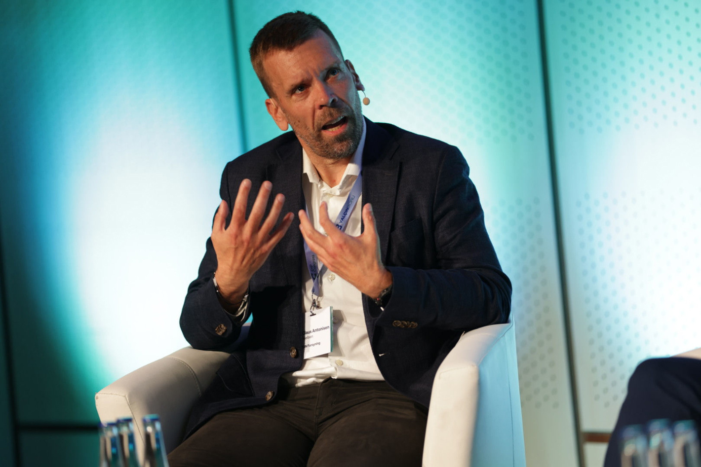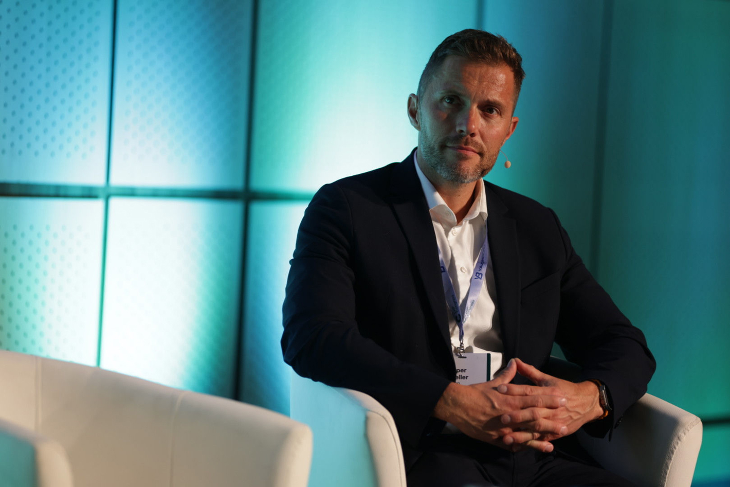 Jesper Møller Larsen fra Verdo deltog onsdag på kongressen i en session om finansiering, hvor Maria Lind Arlaud fra State of Green havde rollen som ordstyrer til paneldebatten. Foto: Foto: Euroheat & Power / BFF Visuals.