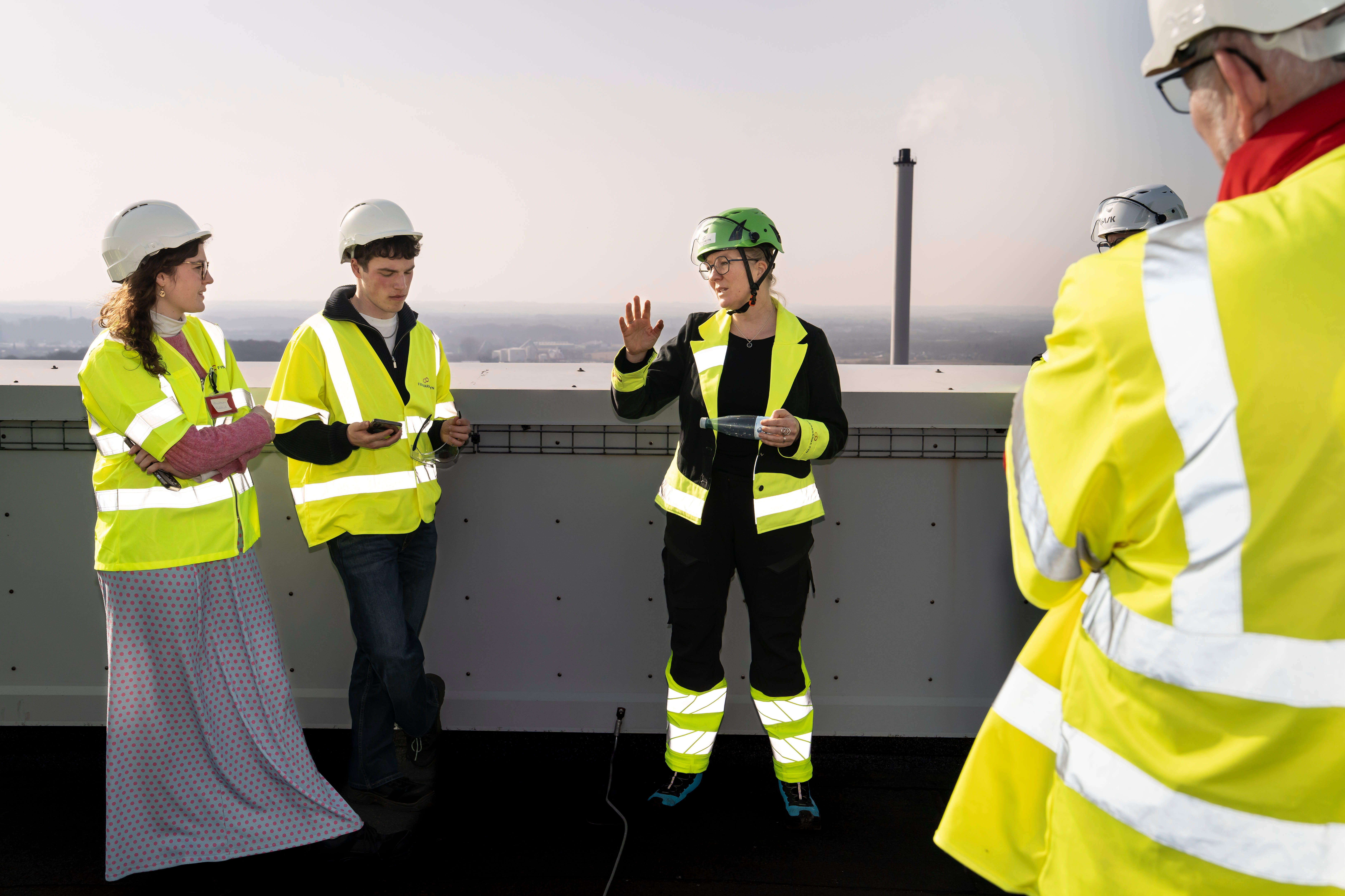 På toppen af Blok 7 fik folketingskandidaterne et godt udsyn både over Fyn og selskabets mange anlæg. Desuden var de ikke blege for at stille Louise Høst spørgsmål. Foto: Alex Tran.
